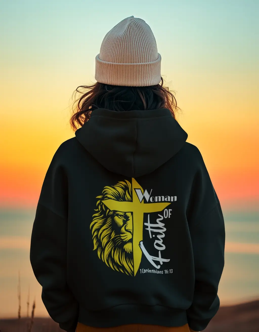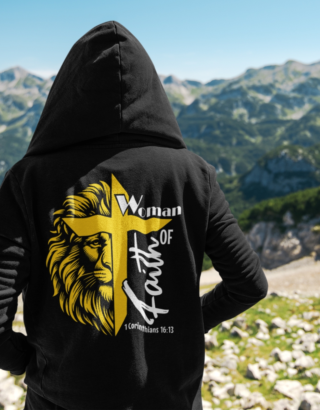 Christian hoodie “Woman of Faith” with lion and cross. Available in black, sizes S–2XL. Customisable and faith-driven.
